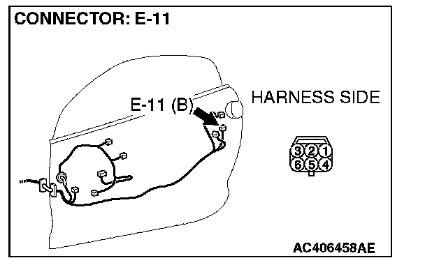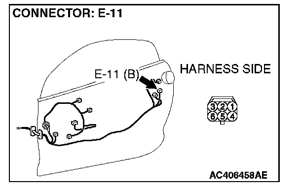 1. Disconnect door lock actuator (LH) connector E-11 and measure the resistance available at the wiring harness side of the connector.