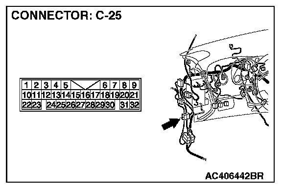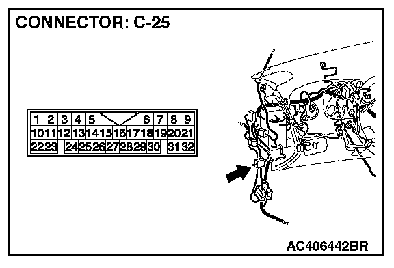 NOTE: Also check intermediate connector C-25 for loose, corroded, or damaged terminals, or terminals pushed back in the connector. If intermediate connector C-25 is damaged, repair or replace the connector as described in Harness Connector Inspection.