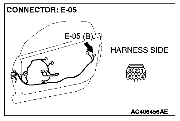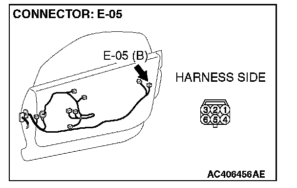 Disconnect door lock actuator (RH) connector E-05. Then check continuity between the terminals. Refer to Body - Door Handle and Latch.