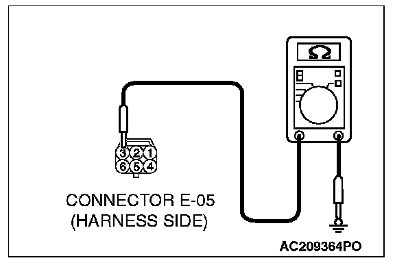 1. Disconnect door lock actuator (RH) connector E-05 and measure the resistance available at the wiring harness side of the connector.