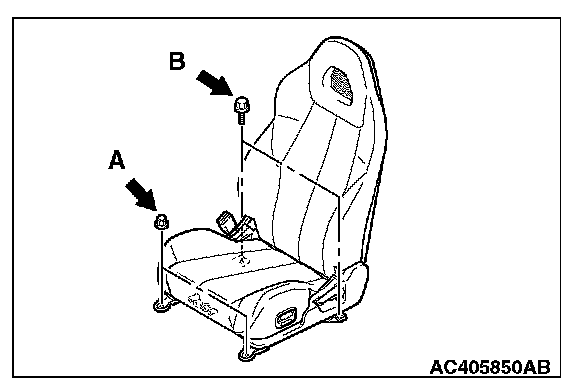 1. Temporarily tighten the nuts in mounting locations shown in the illustration with no weight on the front seat cushion and check the operation of the seat slide.