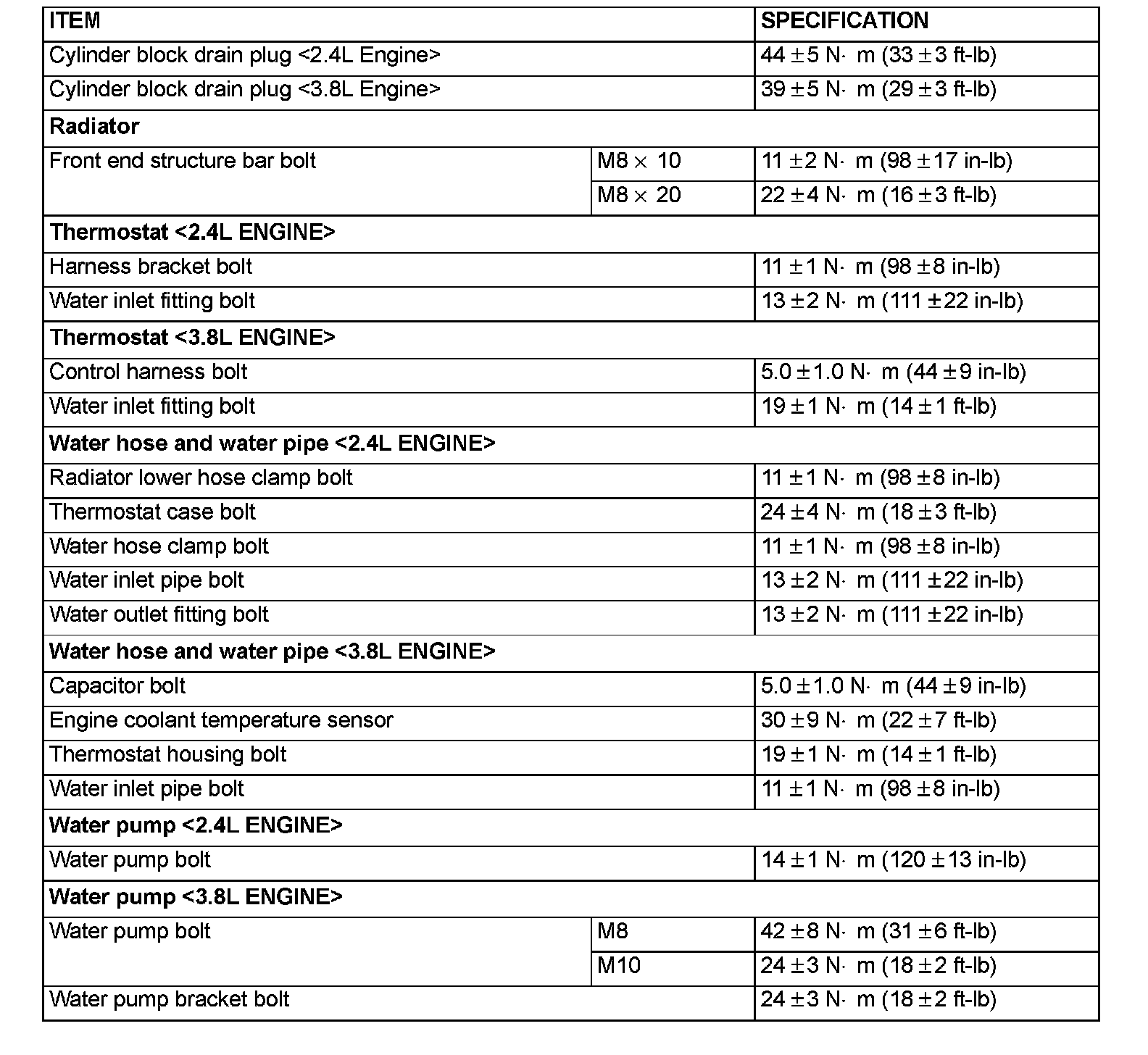 FASTENER TIGHTENING SPECIFICATIONS: