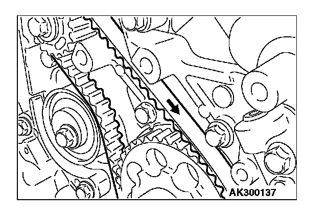 4. Move tensioner "B" in the direction of the arrow while lifting with your finger to give sufficient tension to the tension side of timing belt. In this condition, tighten the bolt to secure tensioner "B." When the bolt is tightened, use care to prevent the tensioner pulley shaft from turning with the bolt. If the shaft is turned with the bolt, the belt will be over tensioned.
