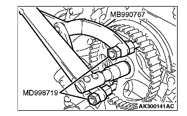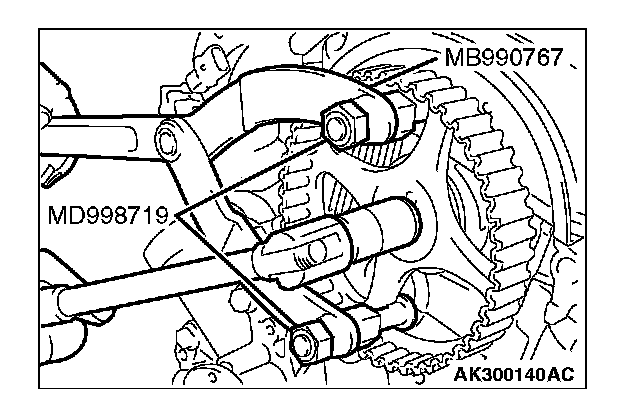 1. While holding the camshaft sprocket with special tools MB990767 and MD998719, loosen the camshaft sprocket bolt.