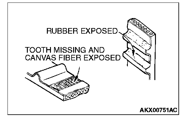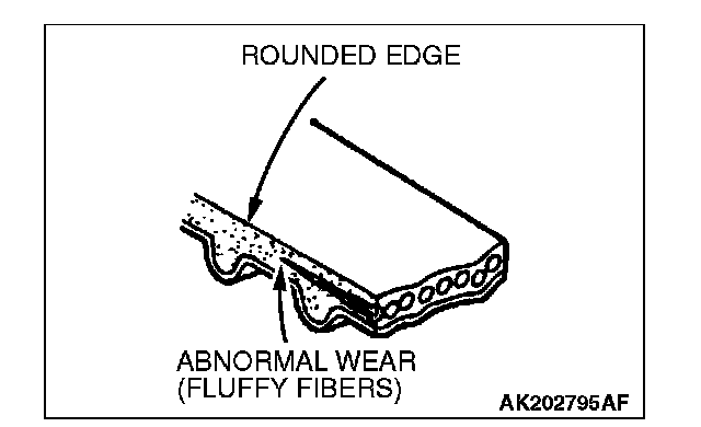 6. Abnormal wear of belt sides. Normal wear is indicated if the sides are sharp as if cut by a knife. Abnormal wear is indicated if the sides are ragged.