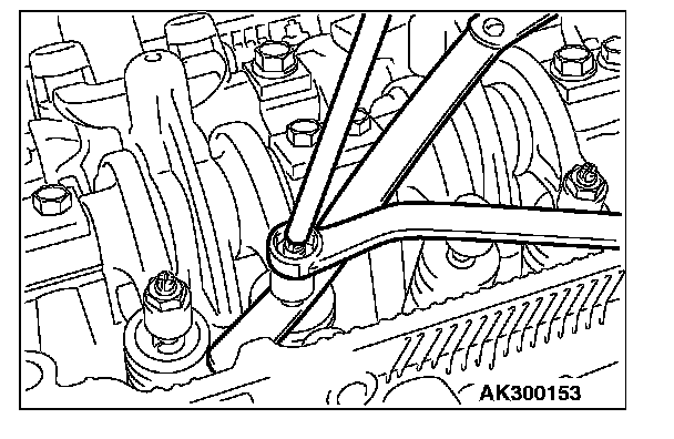11. Install special tool MD998767, socket wrench and torque wrench, onto the tensioner pulley, and loosen the tensioner pulley center bolt.