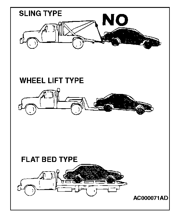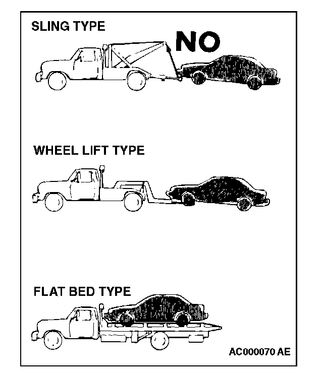 CAUTION: This vehicle cannot be towed by a wrecker using sling-type equipment; otherwise the bumper may become deformed. If this vehicle is towed, use wheel lift or flat bed equipment.