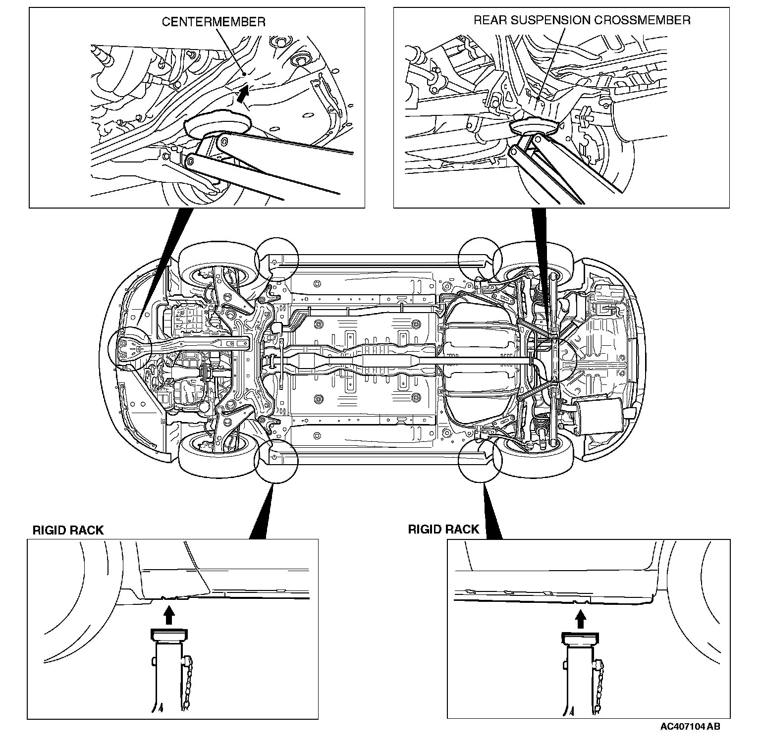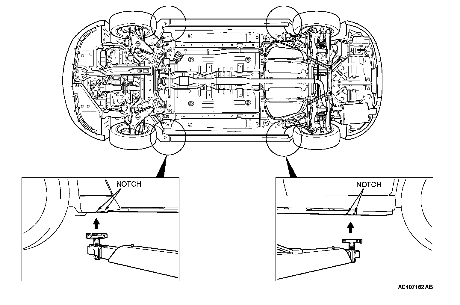 Special care should be taken when raising the vehicle on a frame contact type hoist. The hoist must be equipped with the proper adapters in order to support the vehicle at the proper locations.
