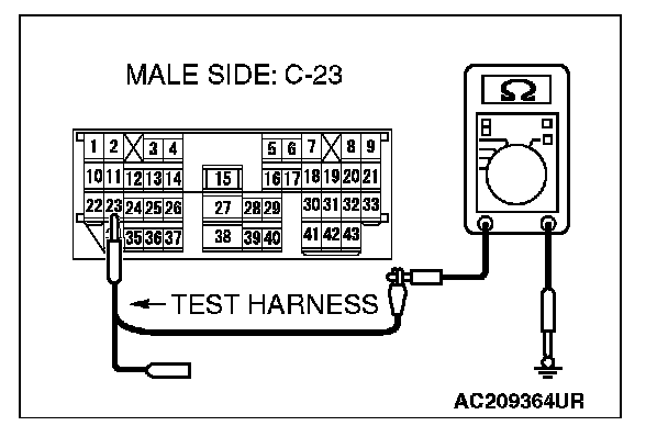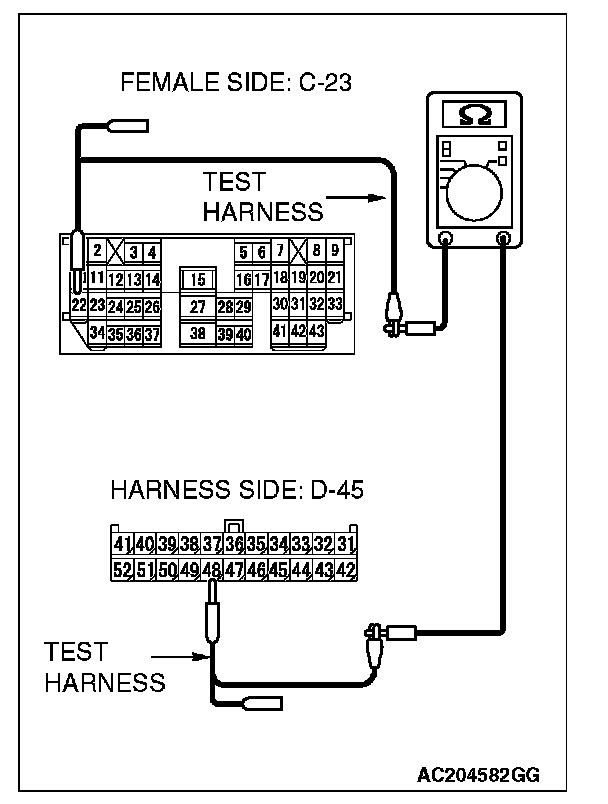 1. Disconnect intermediate connector C-23 and convertible top control module connector D-45, and measure the resistance between the wiring harness side connector of convertible top control module connector D-45 and the male side connector of intermediate connector C-23 (at front wiring harness side).