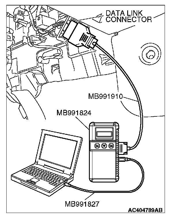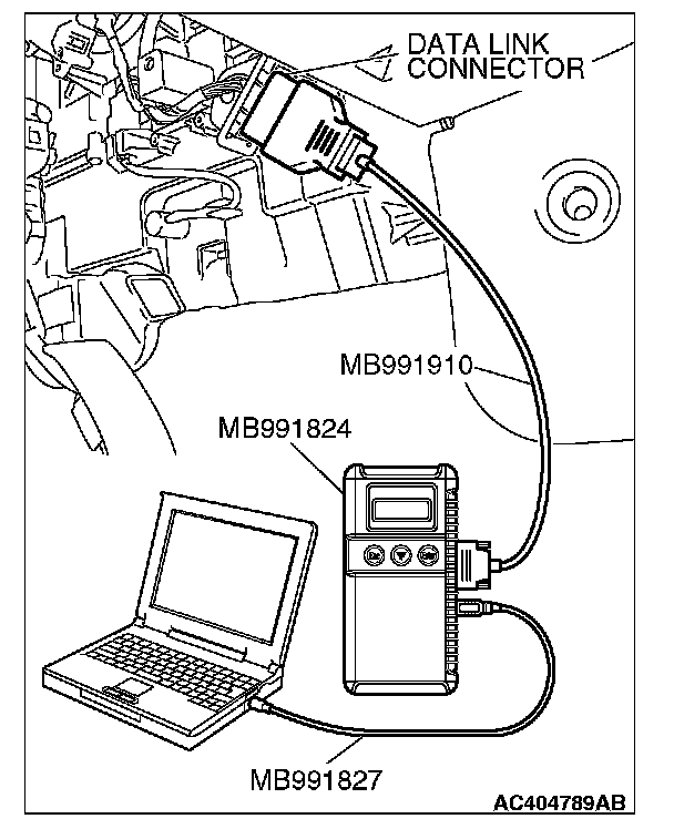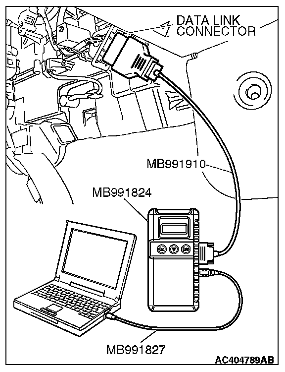 CAUTION: To prevent damage to scan tool MB991958, always turn the ignition switch to the "LOCK" (OFF) position before connecting or disconnecting scan tool MB991958.