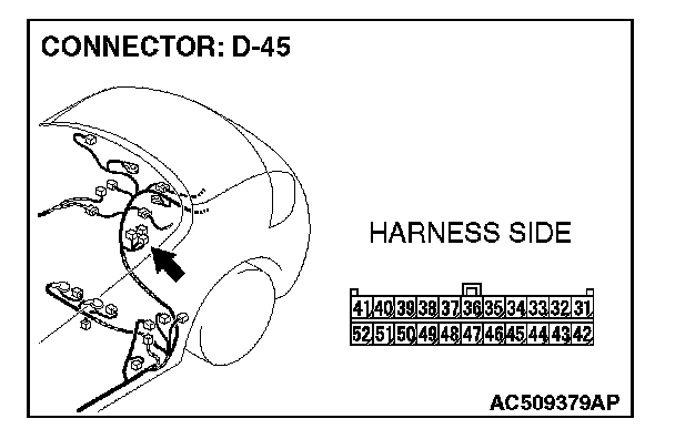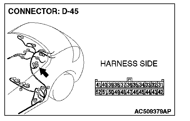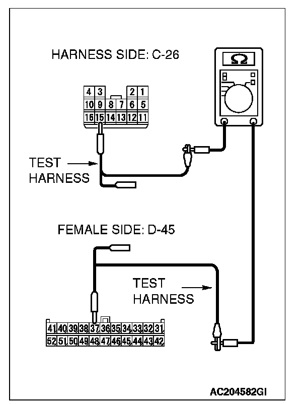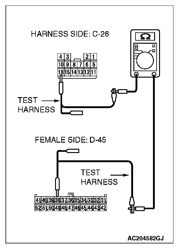 1. Disconnect intermediate connector C-26 and convertible top control module connector D-45, and measure the resistance between the wiring harness side connector of convertible top control module connector D-45 and the male side connector of intermediate connector C-26 (at front wiring harness side).