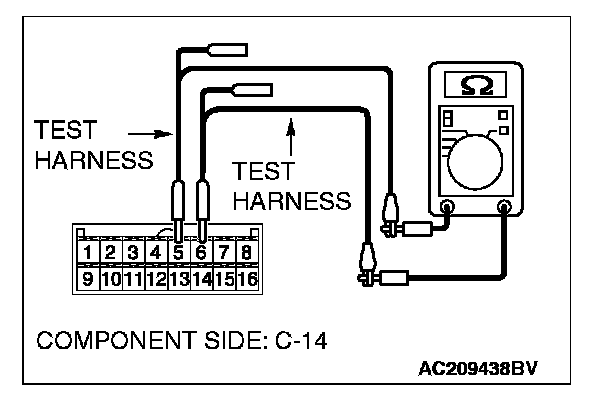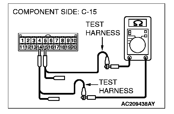 4. Measure the resistance between A/C-ECU connector terminals 14 and 15.