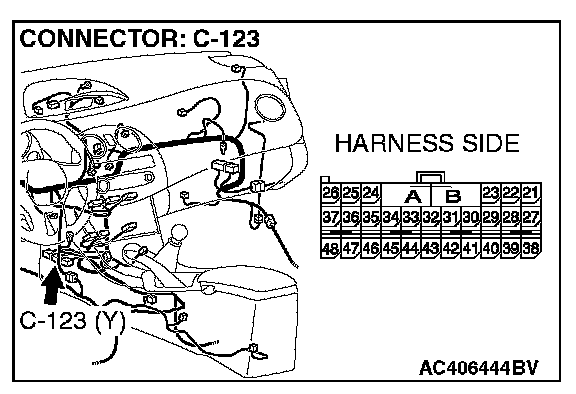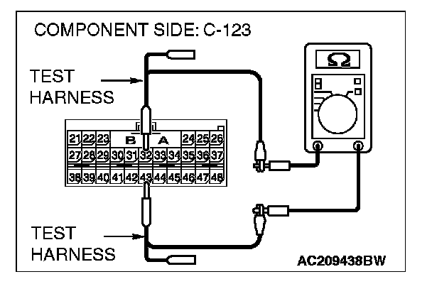 2. Disconnect SRS-ECU connector C-123, and measure the resistance at the component side of SRS-ECU connector C-123.