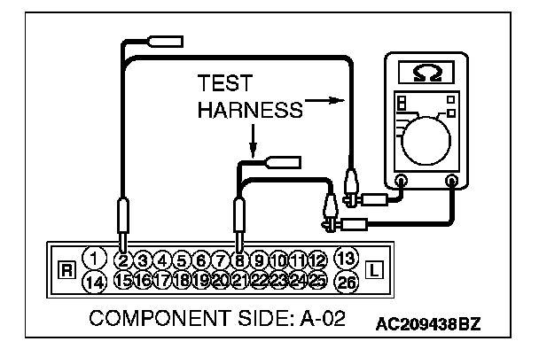 3. Measure the resistance between ABS-ECU connector terminals 2 and 8.