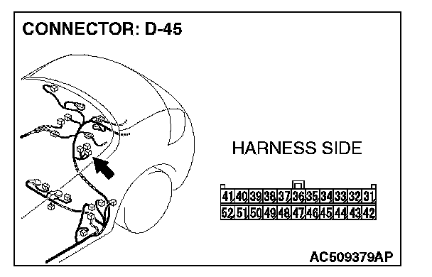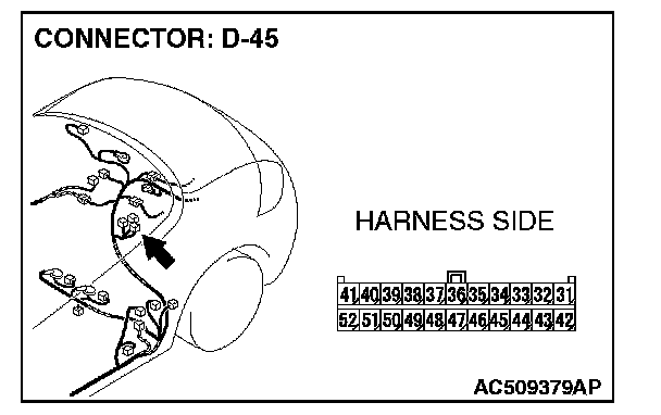 2. Disconnect convertible top control module connector D-45, and measure the resistance at the component side of convertible top control module connector D-45.