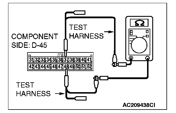 4. Measure the resistance between convertible top control module connector D-45 (terminals 38 and 49).