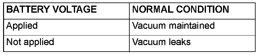 2. Check air tightness by applying a vacuum with voltage applied directly from the battery to the evaporative emission ventilation solenoid and without applying voltage.