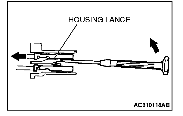 2. Insert the tip of the screwdriver [1.4 mm (0.06 inch) or 2.0 mm (0.08 inch) width] into the connector as shown in the figure, raise the housing lance slightly with the tip, and pull out the terminal.