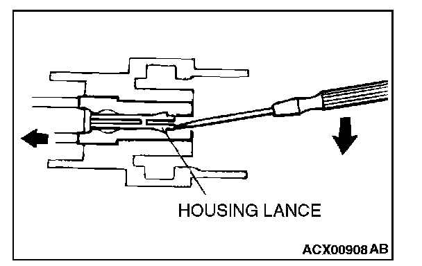 2. Insert the tip of a screwdriver [0.8 mm (0.03 inch) width] into the connector as shown in the figure, push it lightly to raise the housing lance, and pull out the terminal.