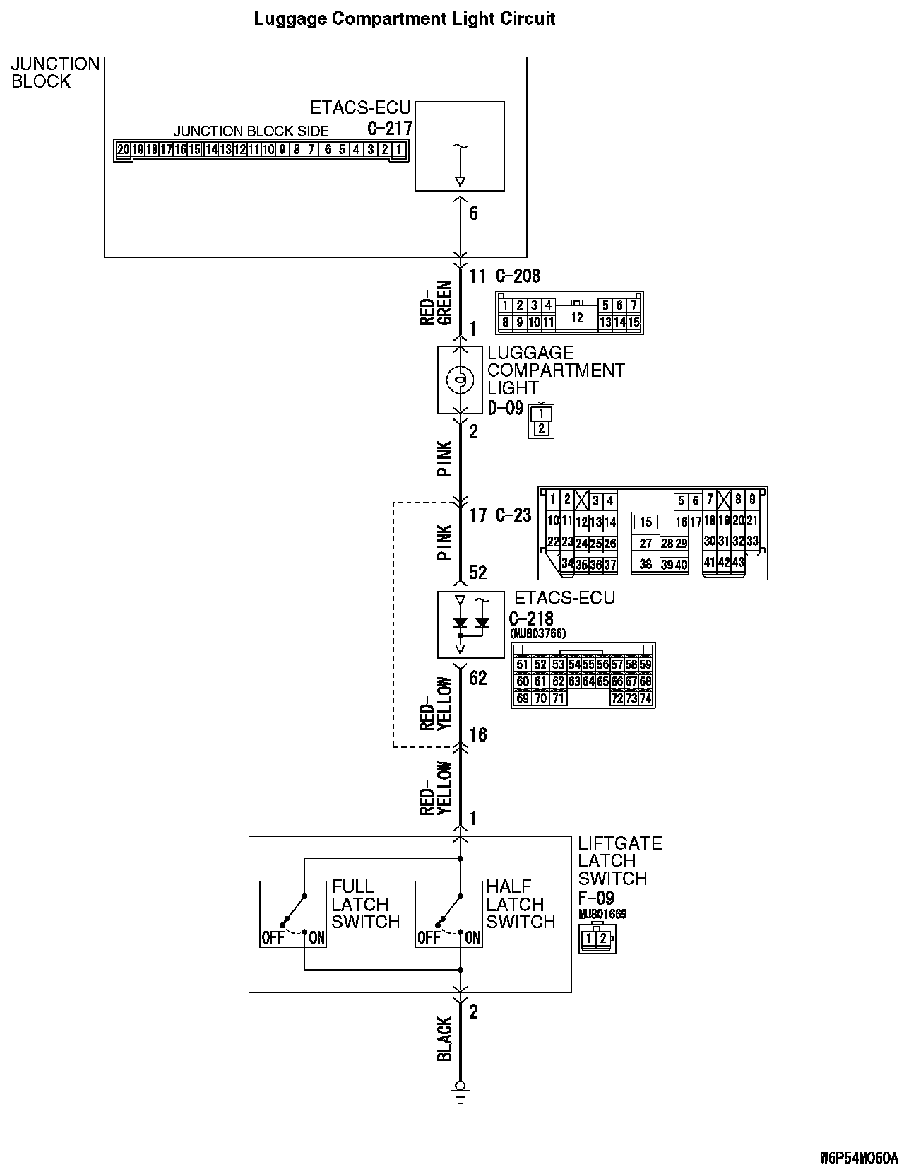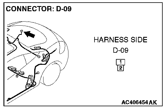 STEP 4. Check the wiring harness between luggage compartment light connector D-09 (terminals 1 and 2) and ETACS-ECU connector C-217 (terminal 6) or C-218 (terminal 52).