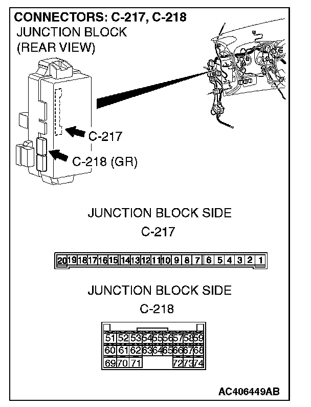 STEP 2. Check luggage compartment light connector D-09, ETACS-ECU connectors C-217 and C-218 and for loose, corroded or damaged terminals, or terminals pushed back in the connector.
