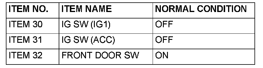 Q: Does the scan tool MB991958 display the items "IG SW (IG1)", "IG SW (ACC)" and "FRONT DOOR SW" as normal condition?