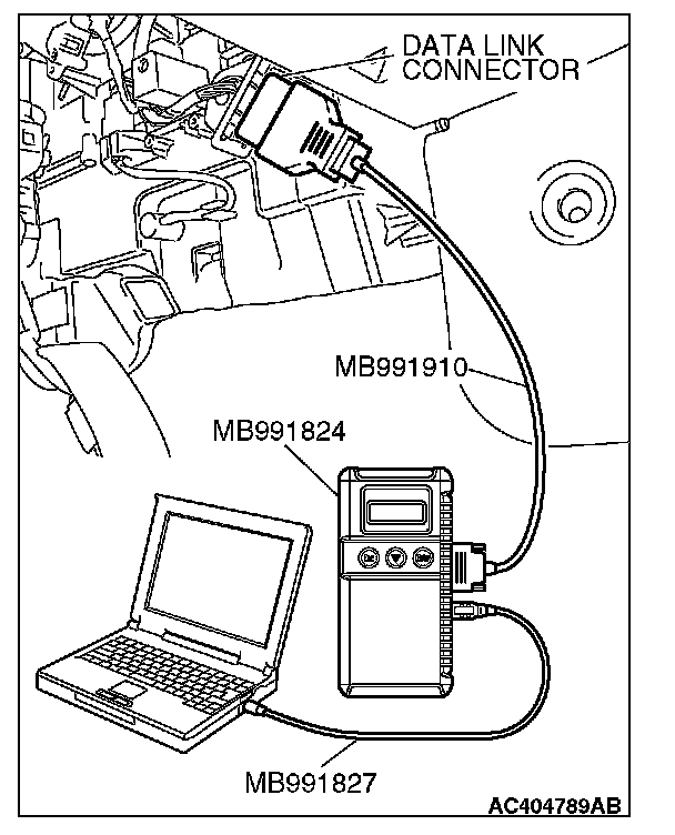 CAUTION: To prevent damage to scan tool MB991958, always turn the ignition switch to the "LOCK" (OFF) position before connecting or disconnecting scan tool MB991958. Connect special tool MB991910 before connecting special tool MB991812. Be sure to connect special tool MB991806 after turning on special tool MB991824.