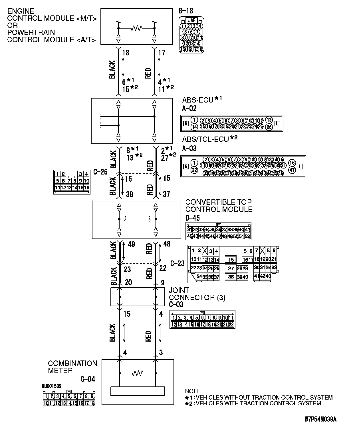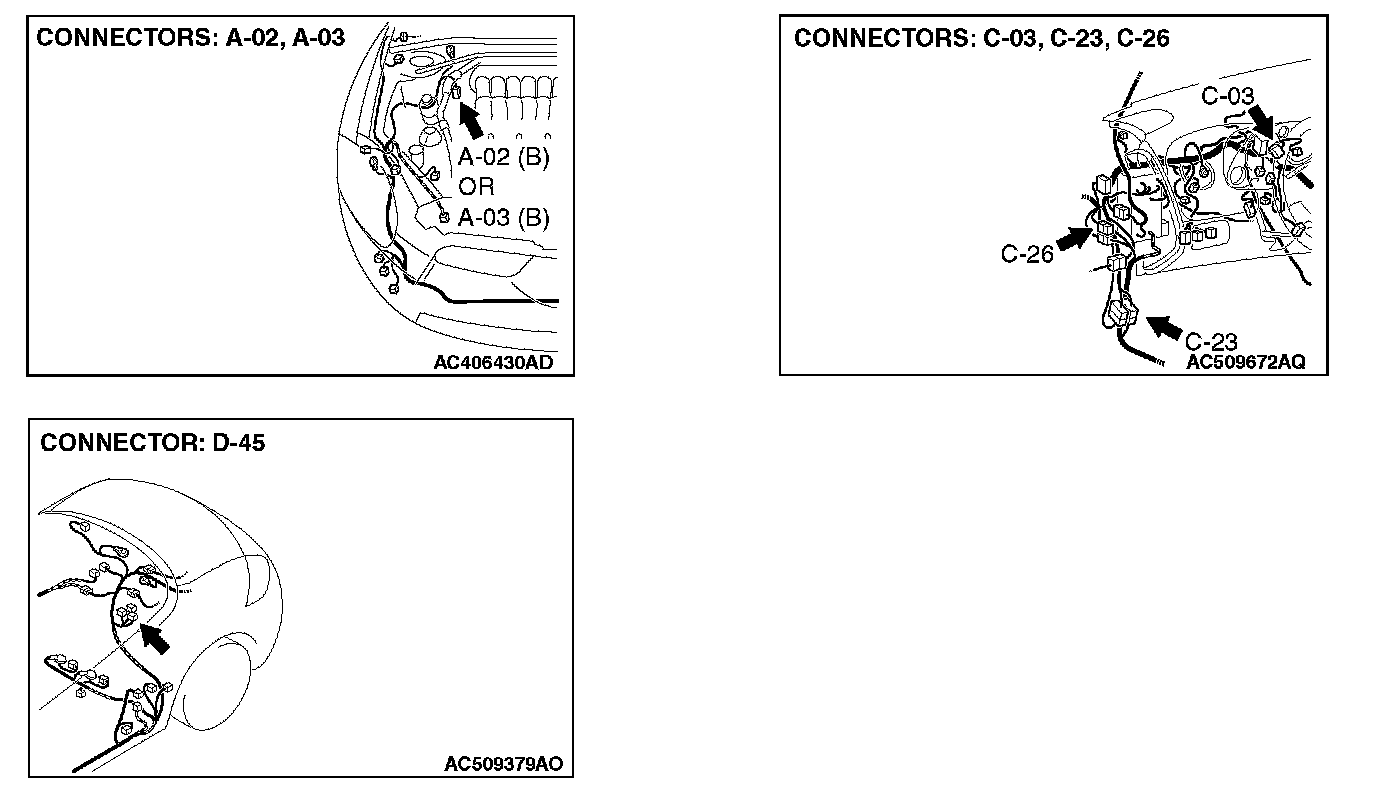 STEP 1. Check joint connector (3) C-03 and convertible top control module connector D-45 for loose, corroded or damaged terminals, or terminals pushed back in the connector.