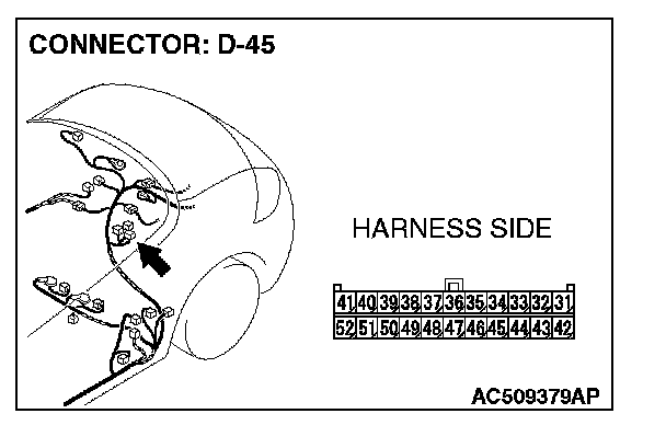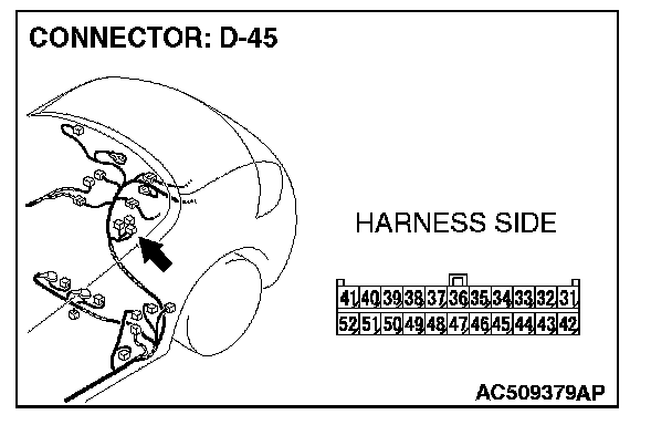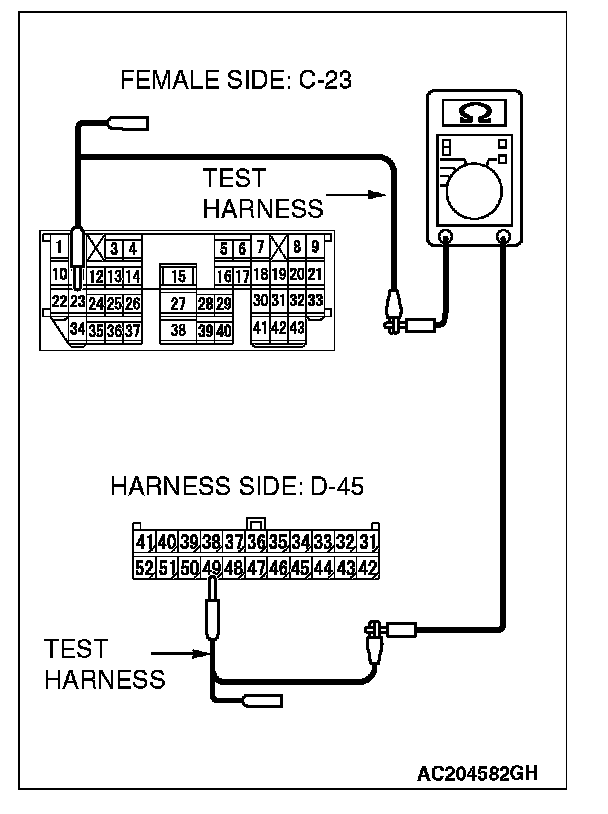 1. Disconnect intermediate connector C-23 and convertible top control module connector D-45, and measure the resistance between the wiring harness side connector of convertible top control module connector D-45 and the male side connector of intermediate connector C-23 (at front wiring harness side).