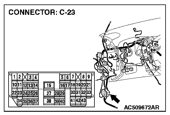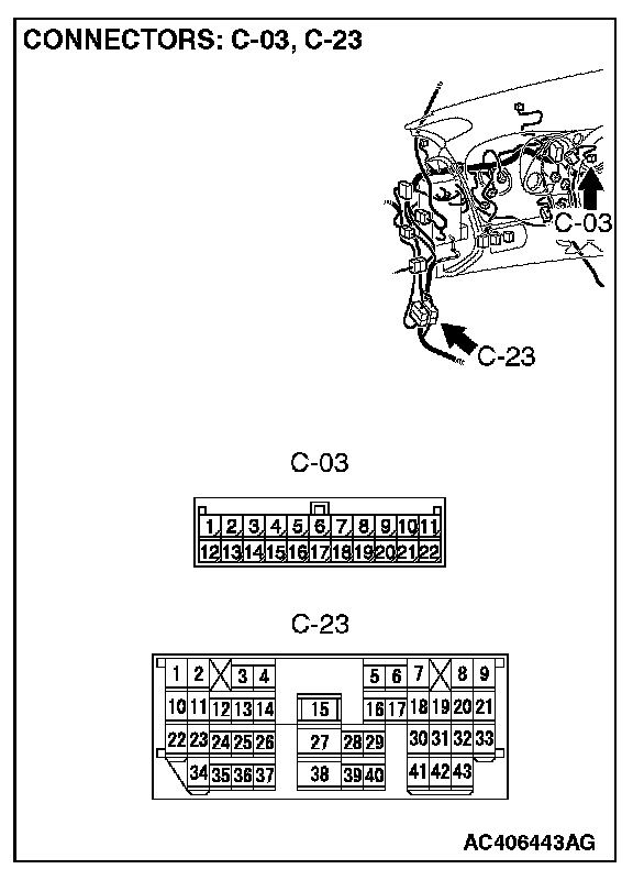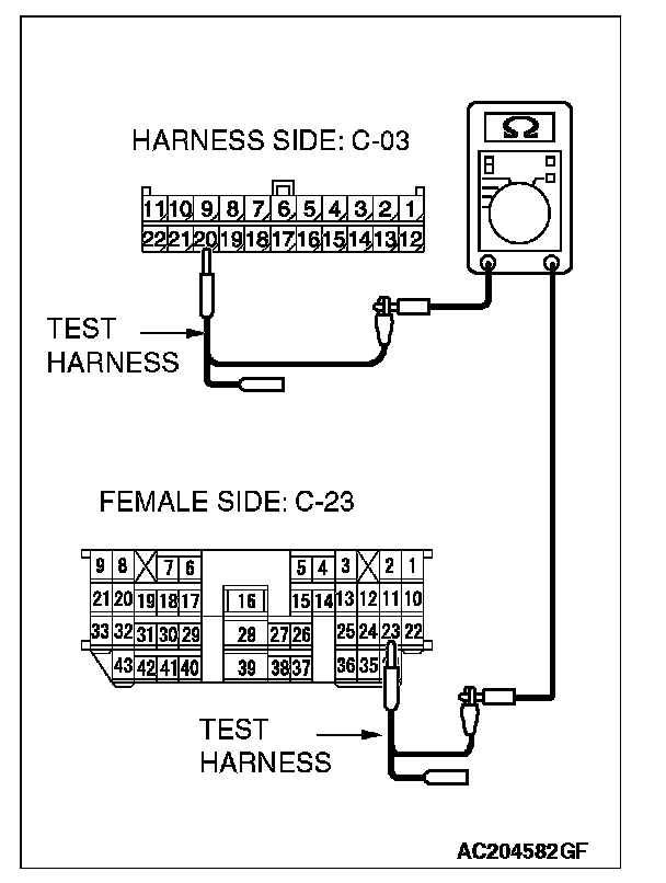 1. Disconnect intermediate connector C-23 and joint connector (3) C-03, and measure the resistance between the wiring harness side connector of joint connector (3) C-03 and the male side connector of intermediate connector C-23 (at front wiring harness side).