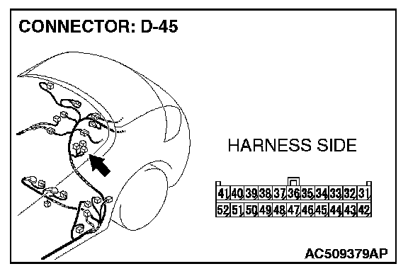 1. Disconnect convertible top control module connector D-45, and measure the resistance at the component side of convertible top control module connector D-45.