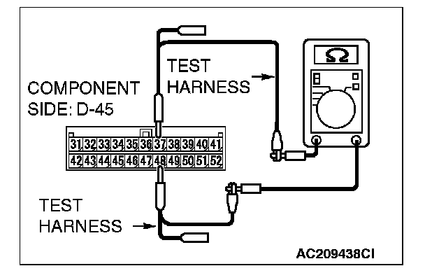 2. Measure the resistance between convertible top control module connector D-45 (terminals 48 and 37).