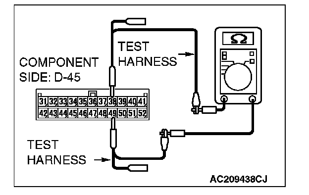 3. Measure the resistance between convertible top control module connector D-45 (terminals 49 and 38).