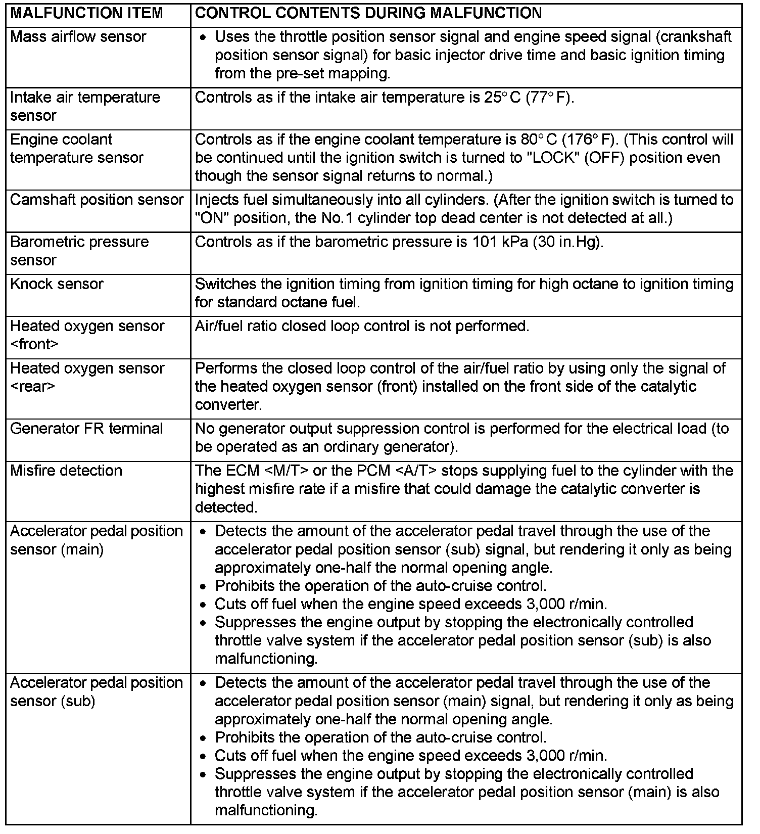 When the main sensor malfunctions are detected by the diagnostic test mode, the vehicle is controlled by means of the following defaults.