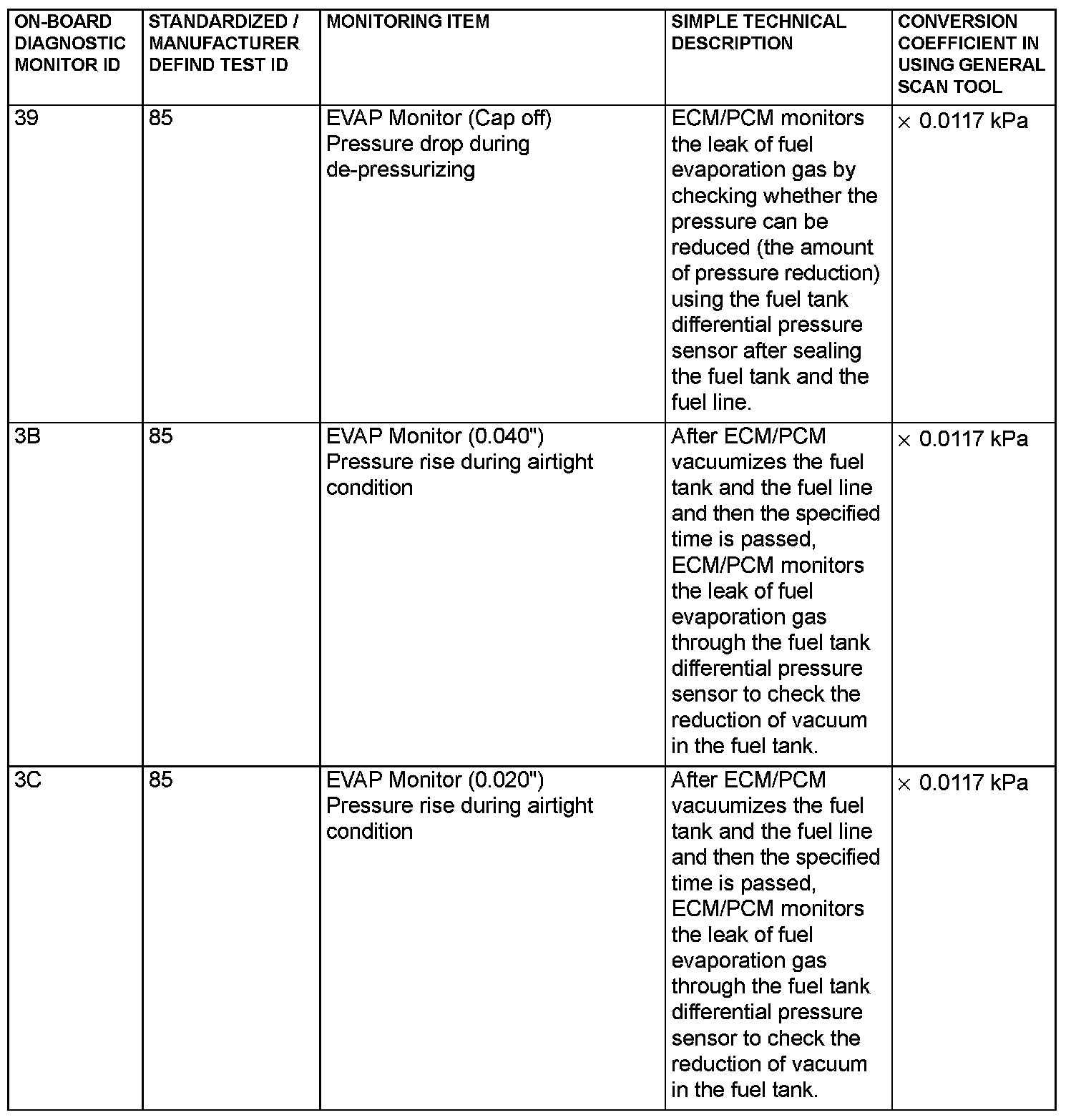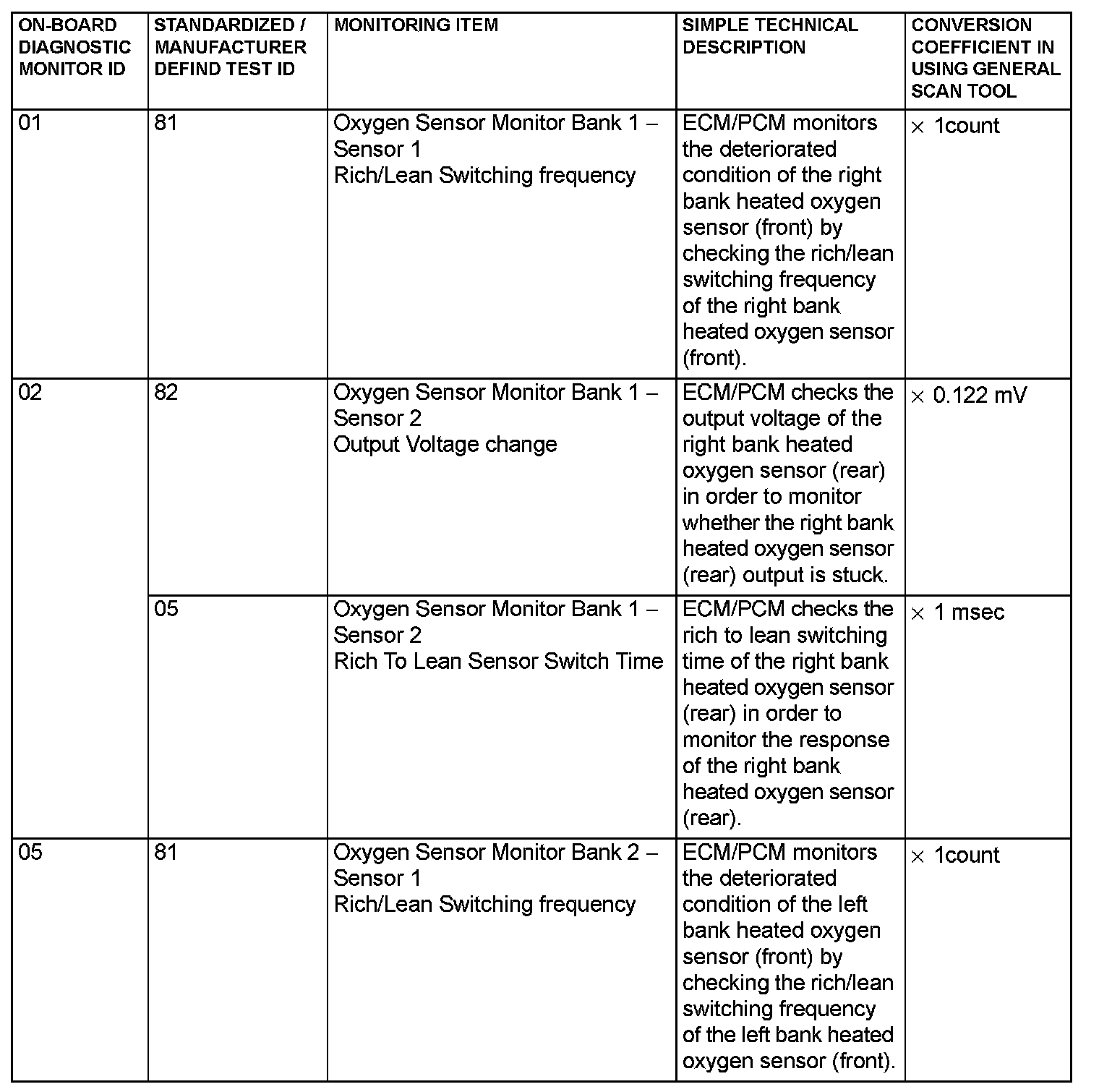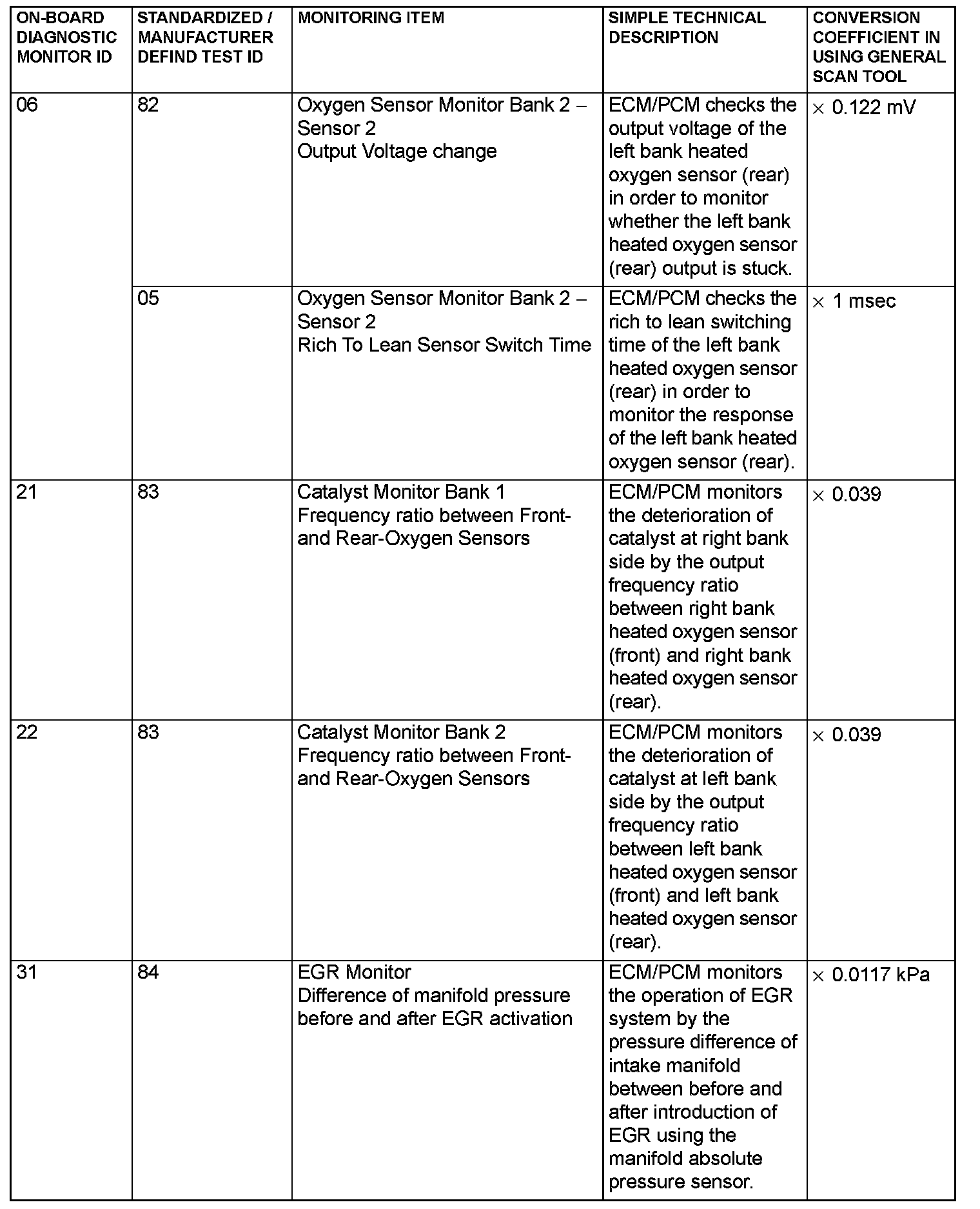 - When the monitored test results are erased by the battery disconnection and so on, the ECM/PCM outputs the values in hexadecimal of "0000" or "FFFF", otherwise it outputs abnormal values and so on. In case of this, the ECM/PCM outputs are handled as invalid- values. When the first monitor (Readiness Status) is completed after this, the ECM/PCM outputs the valid-values.