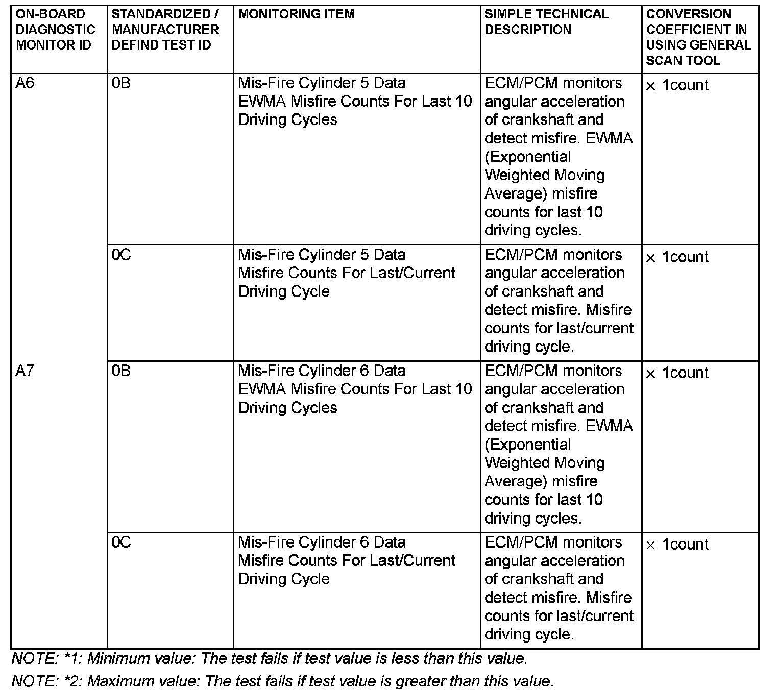By selecting MODE 6 using scan tool, Test Result and Limit Value (minimum) *1 or (maximum) *2 about the main items of emission control system which ECM/PCM monitors can be confirmed. The value at the last monitoring is output by ECM/PCM as a test result.