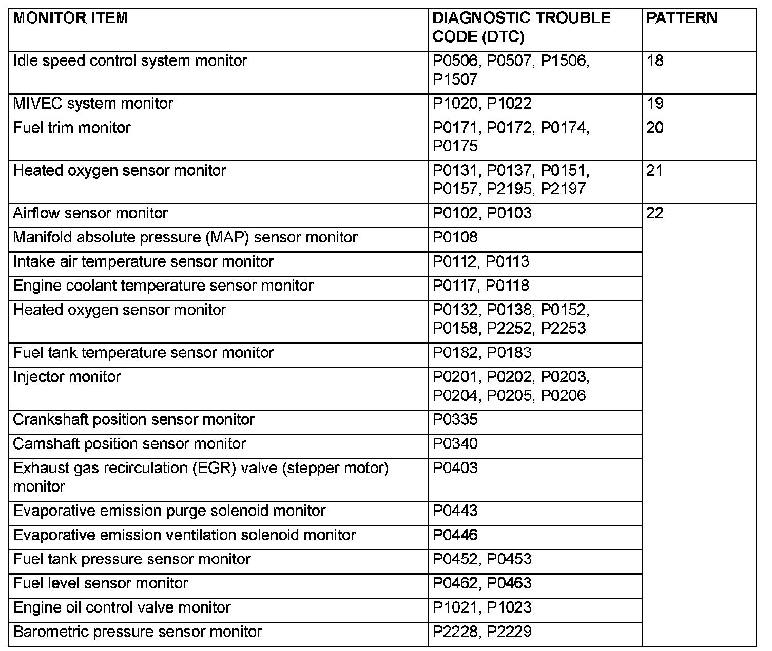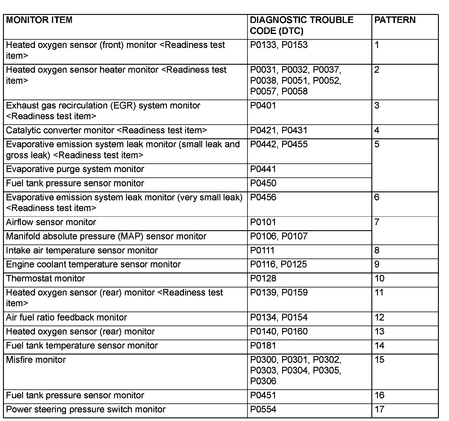 - Drive cycle patterns are not established for Vehicle speed sensor monitor (DTC P0500), Power steering pressure switch monitor (DTC P0551), and Fuel level sensor monitor (DTC P0461, P2066). Please reference the M.U.T. data list to judge whether these monitor items are normal.