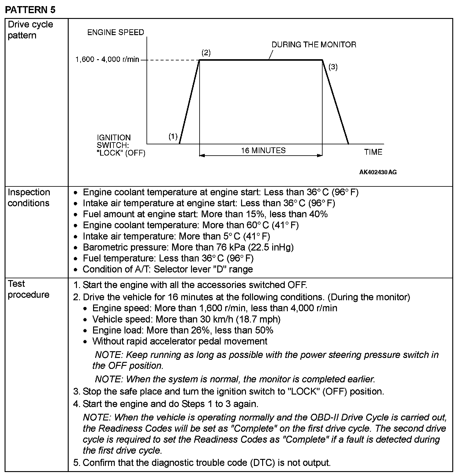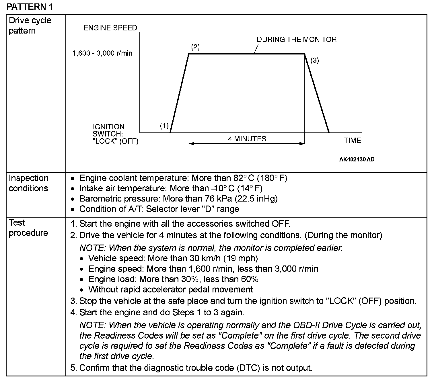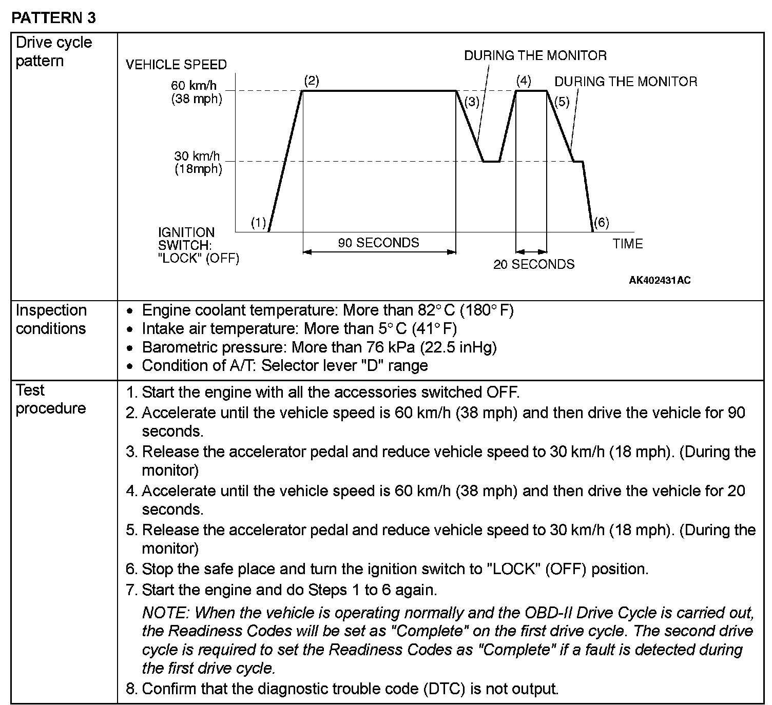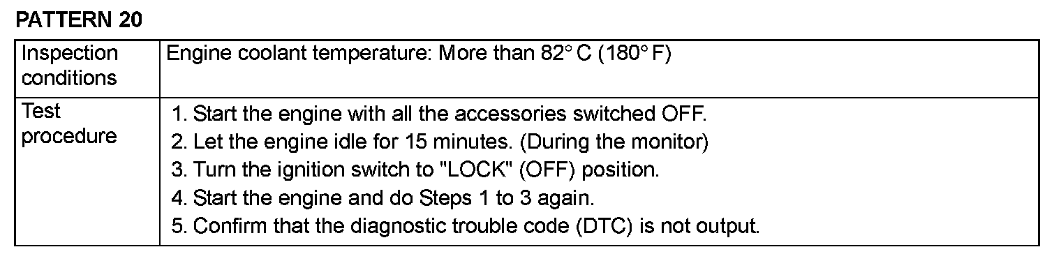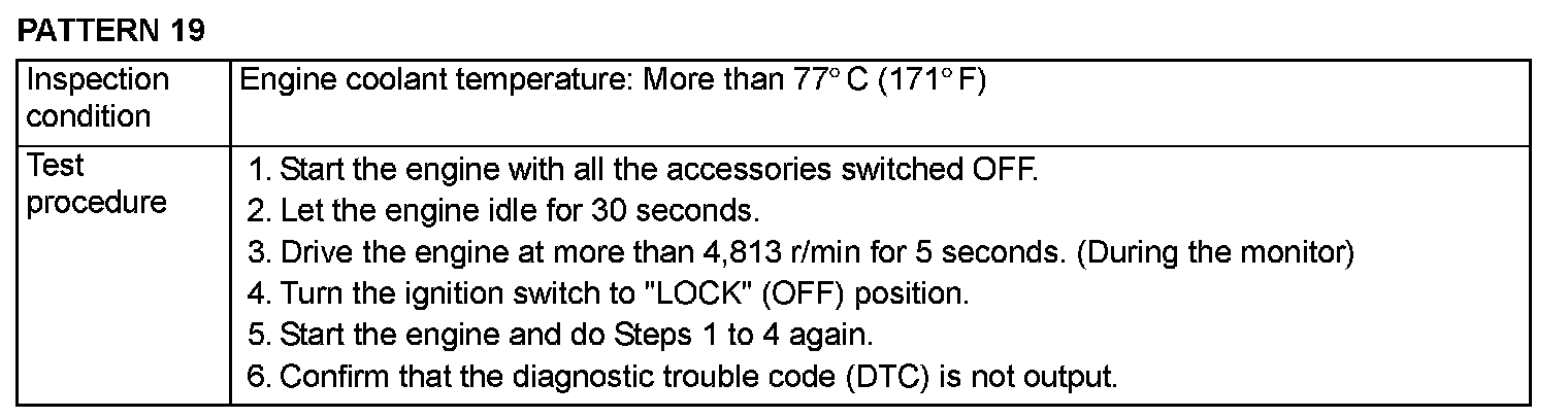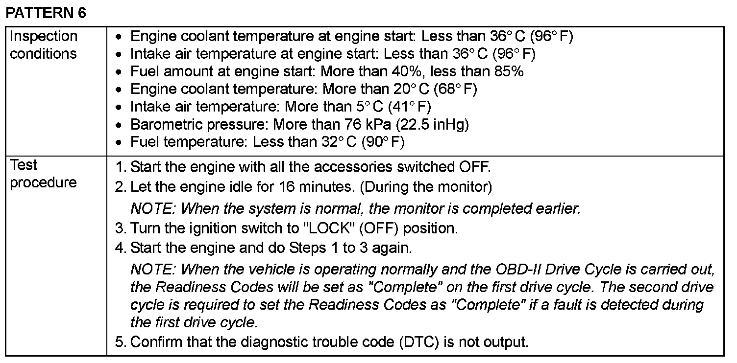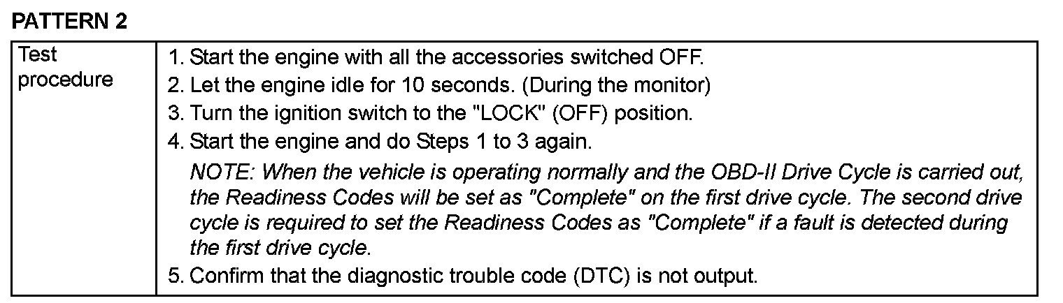 OBD-II DRIVE CYCLEAll kinds of diagnostic trouble codes (DTCs) can be monitored by carrying out a short drive according to the following 22 drive cycle patterns. In other words, doing such a drive regenerates any kind of trouble which involves illuminating the Malfunction Indicator Lamp (SERVICE ENGINE SOON or Check Engine Lamp) and verifies the repair procedure has eliminated [the trouble the Malfunction Indicator Lamp (SERVICE ENGINE SOON or Check Engine Lamp) is no longer illuminated].