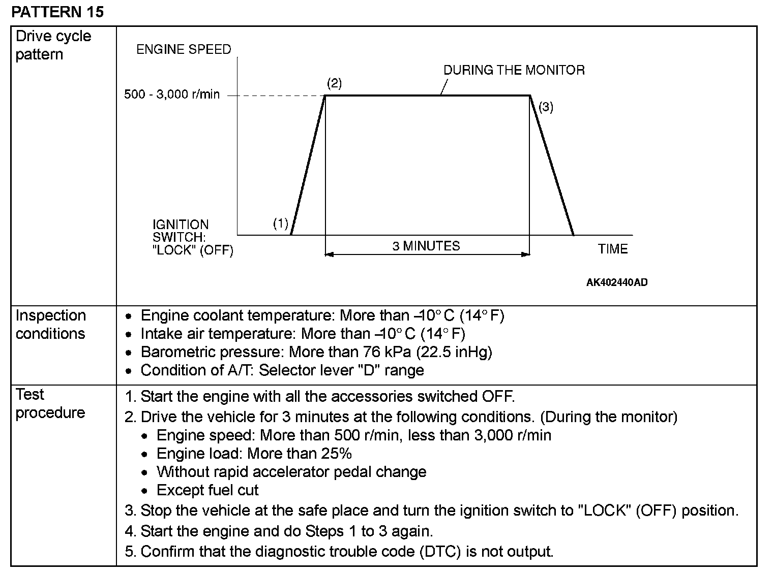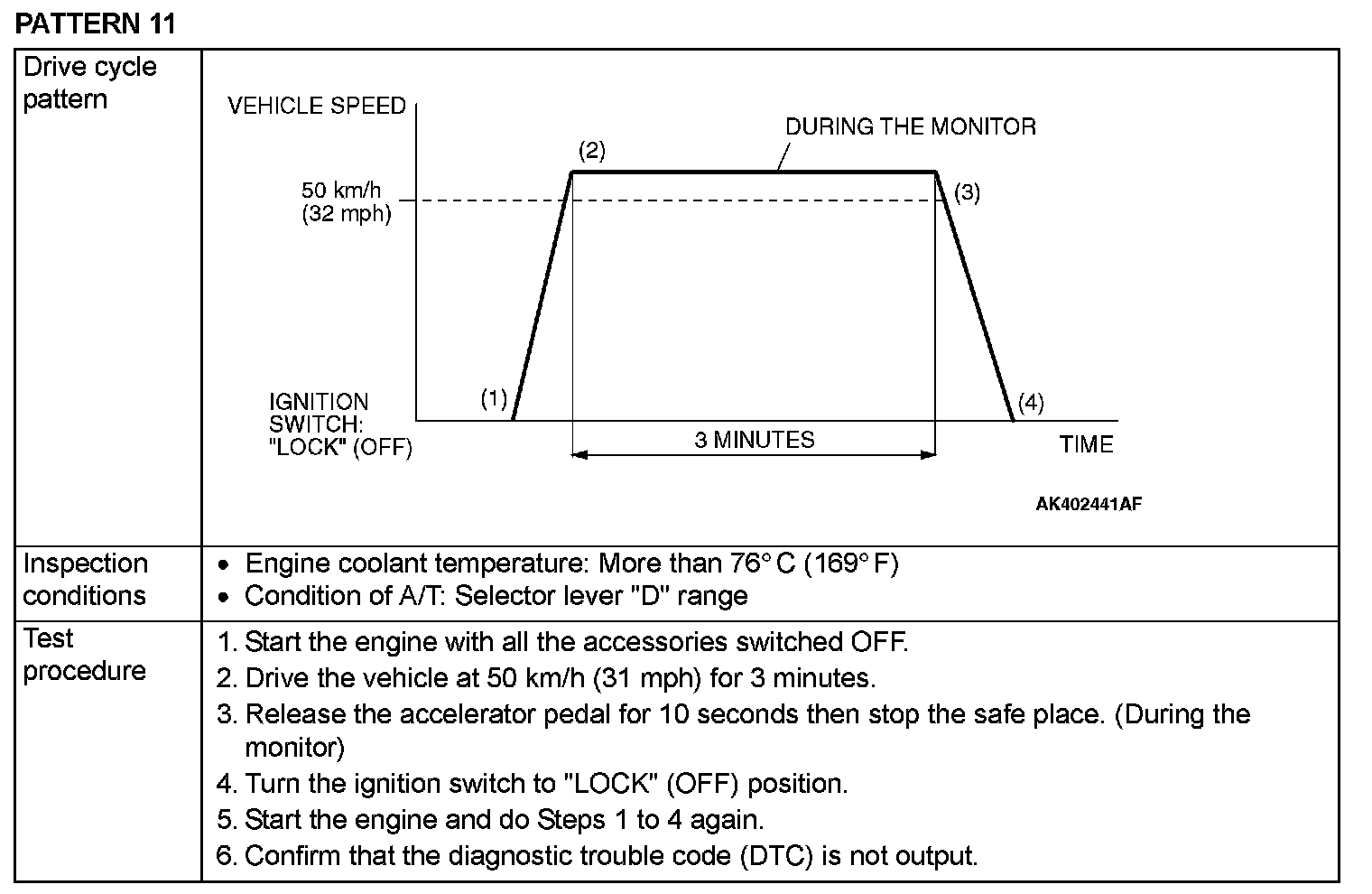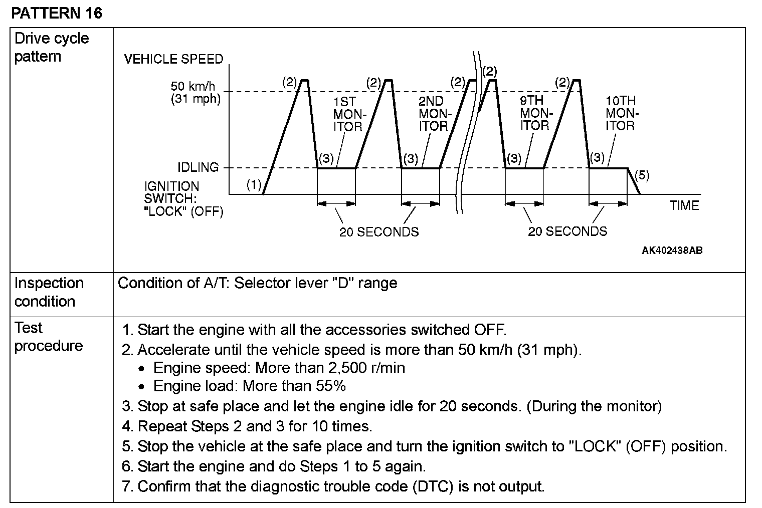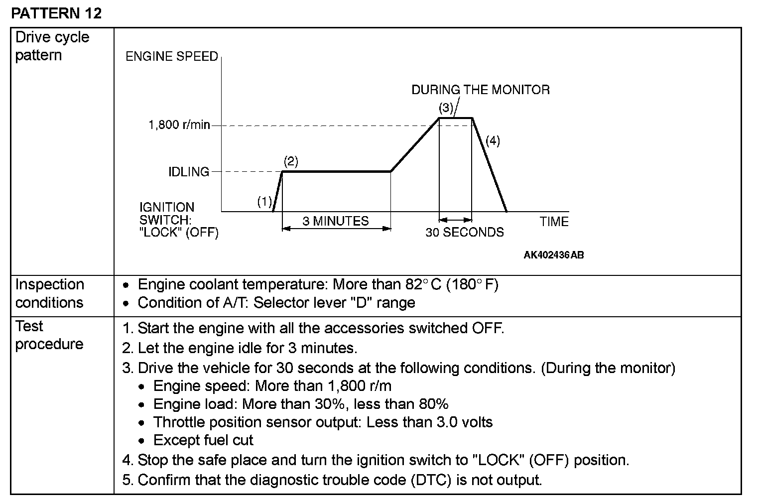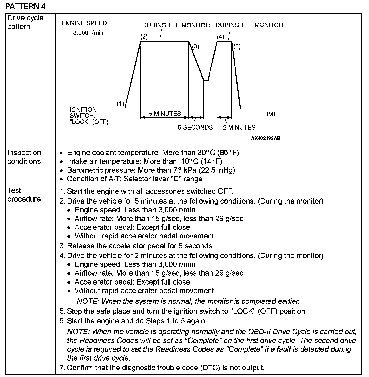 OBD-II DRIVE CYCLEAll kinds of diagnostic trouble codes (DTCs) can be monitored by carrying out a short drive according to the following 22 drive cycle patterns. In other words, doing such a drive regenerates any kind of trouble which involves illuminating the Malfunction Indicator Lamp (SERVICE ENGINE SOON or Check Engine Lamp) and verifies the repair procedure has eliminated [the trouble the Malfunction Indicator Lamp (SERVICE ENGINE SOON or Check Engine Lamp) is no longer illuminated].