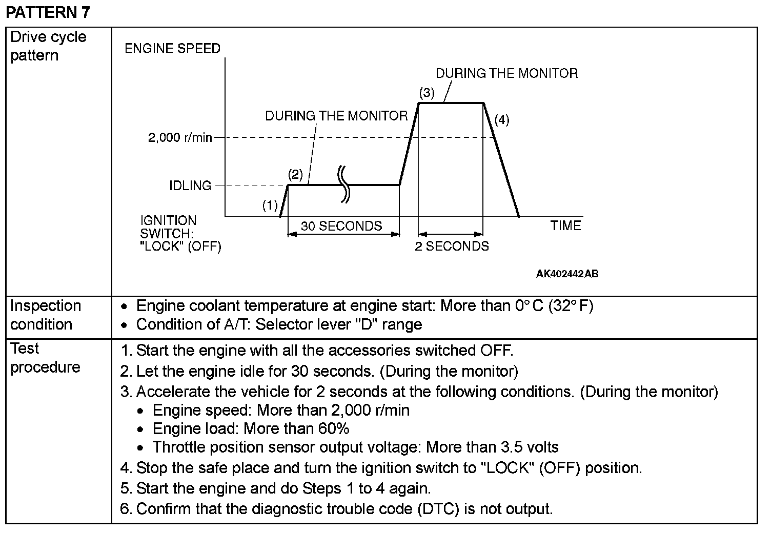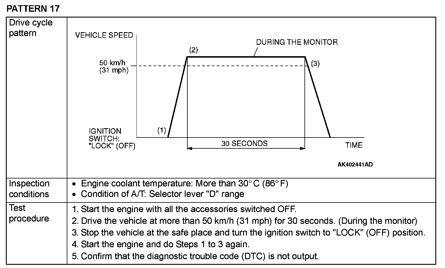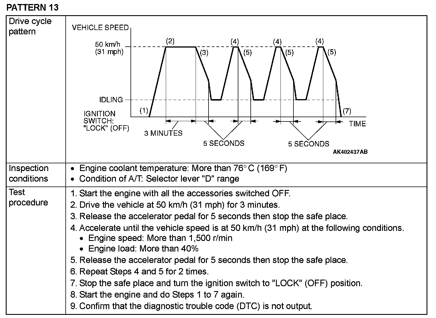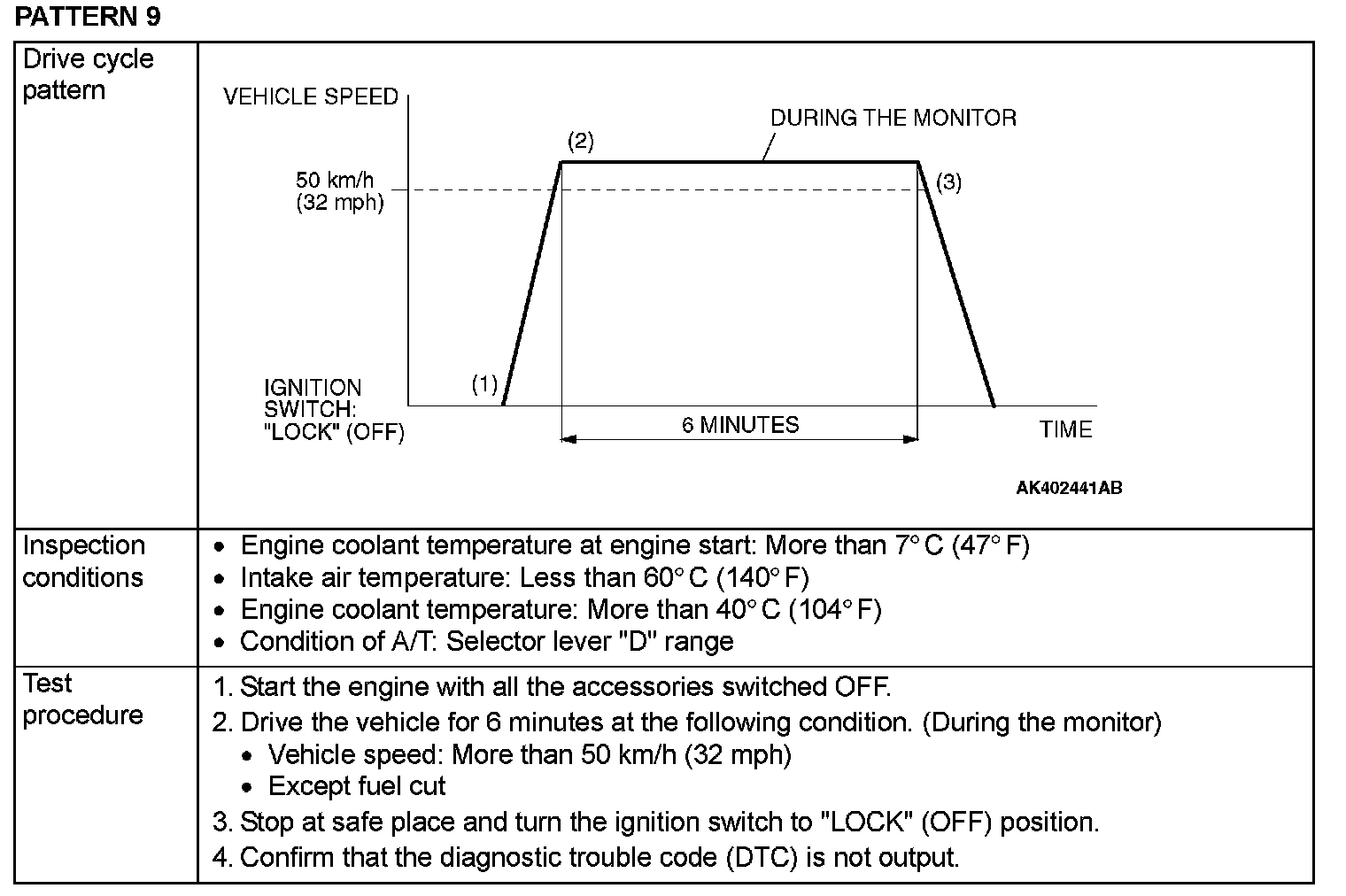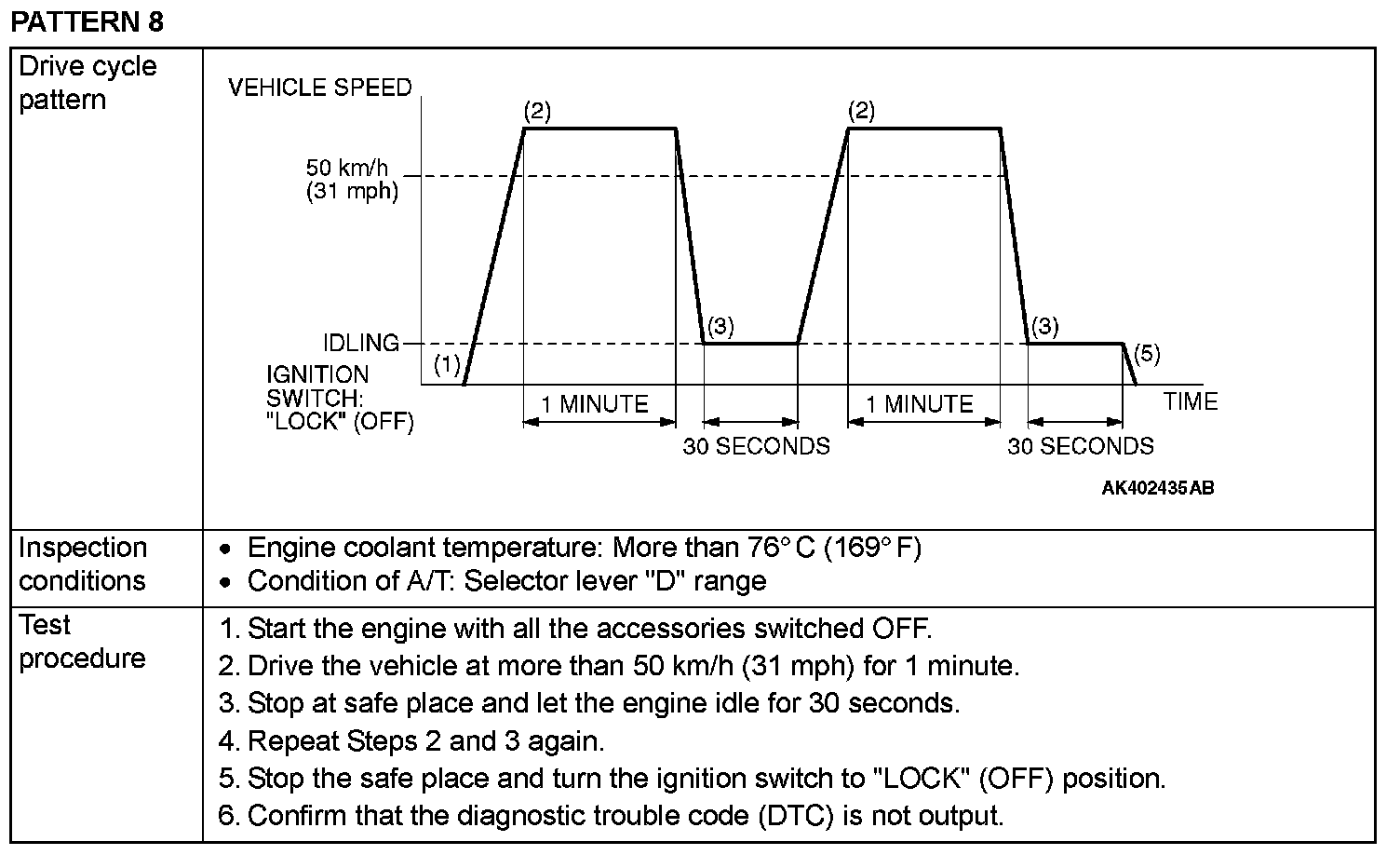 OBD-II DRIVE CYCLEAll kinds of diagnostic trouble codes (DTCs) can be monitored by carrying out a short drive according to the following 22 drive cycle patterns. In other words, doing such a drive regenerates any kind of trouble which involves illuminating the Malfunction Indicator Lamp (SERVICE ENGINE SOON or Check Engine Lamp) and verifies the repair procedure has eliminated [the trouble the Malfunction Indicator Lamp (SERVICE ENGINE SOON or Check Engine Lamp) is no longer illuminated].