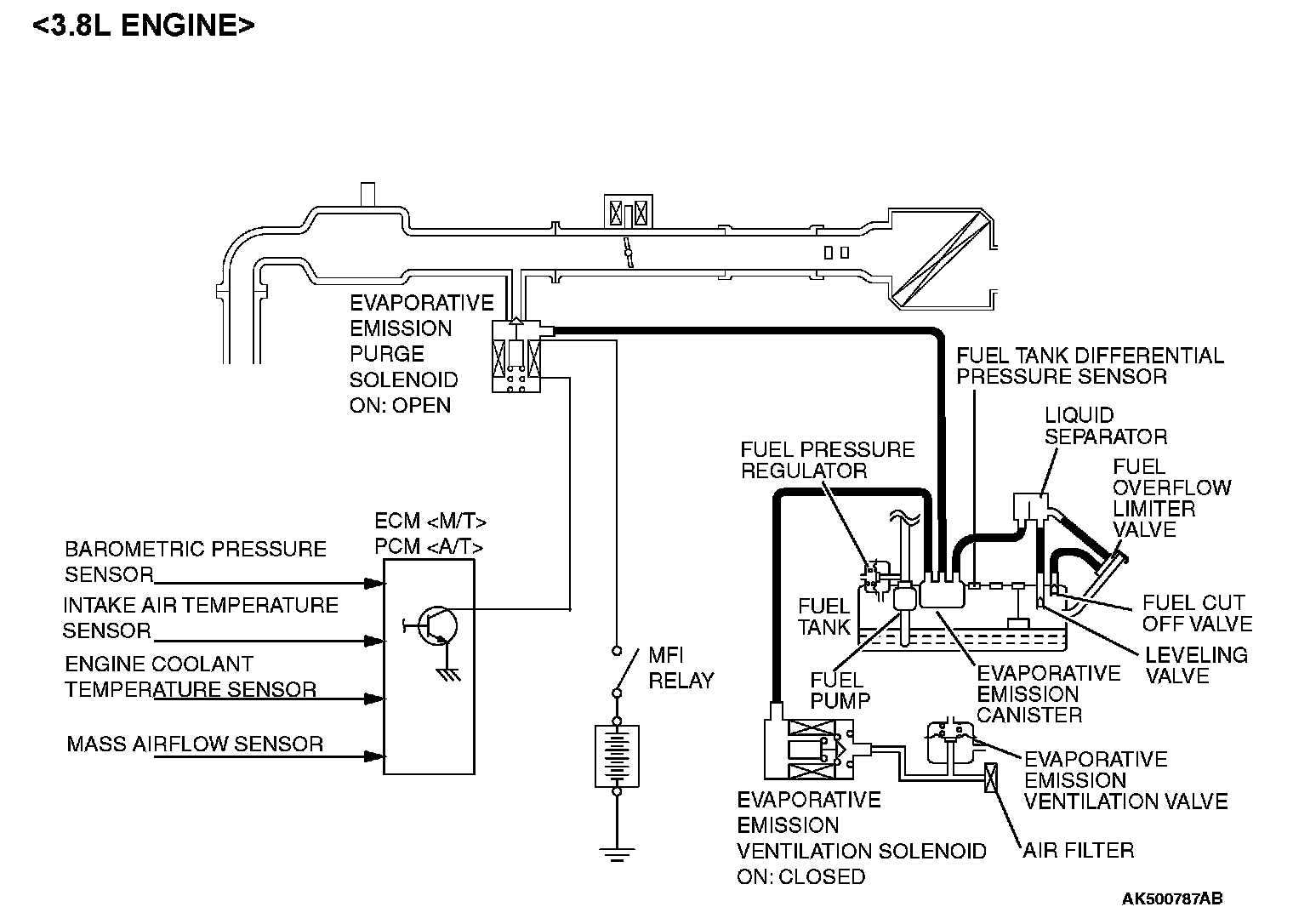 An EVAP ventilation solenoid is provided between the EVAP canister and atmosphere to monitor for OBD-II EVAP leaks. This solenoid is normally OFF. However, it turns ON when monitoring the OBD-II EVAP leaks and shuts off the atmosphere flow to the EVAP canister. Then the fuel tank differential pressure sensor monitors the fuel vapor pressure to detect OBD-II EVAP leaks. The fuel overflow limiter valve and the leveling valve prevent fuel from being overfilled. The fuel overflow limiter valve and the leveling valve prevents fuel leaks if the vehicle is rolled over in an accident.