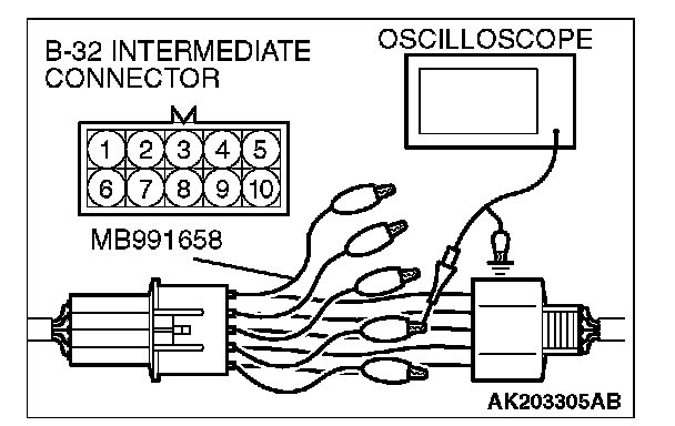 2. Connect the oscilloscope probe to each intermediate connector B-32 terminal to analyze each cylinder: