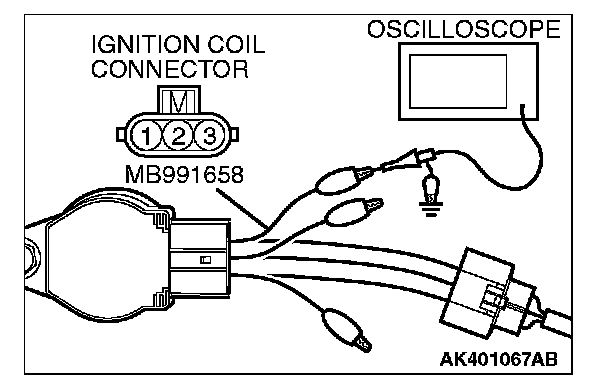 1. Disconnect the ignition coil connector, and connect test harness special tool (MB991658) between the separated connector. (All terminals should be connected.)