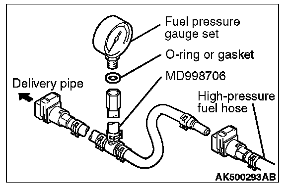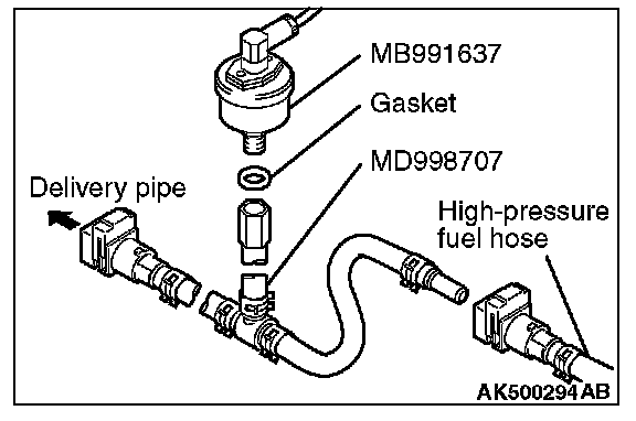 1. Via a gasket, install the special tool MB991637 (fuel pressure gauge set) into the special tool that has already assembled as described.