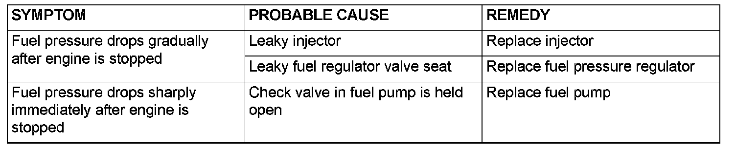 14. Stop the engine and observe fuel pressure gauge reading. It is normal if the reading does not drop within two minutes. If it does, observe the rate of drop and troubleshoot and repair according to the table. Start, then stop the engine.