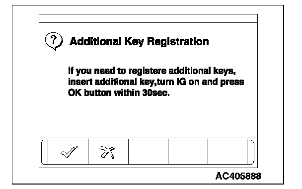 9. When the ignition key registration is finished, the additional key registration menu is displayed. To register the additional key, insert the key and turn the ignition switch to the "ON" position. Then, press the OK button. Press the CANCEL button to terminate the ignition key registration.
