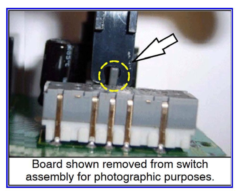 6. Look inside the switch assembly. Ensure the switch slide is in the correct position. It should be aligned with the outline around the slide switch assembly.