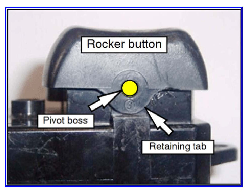 8. Press the new rocker button onto the switch assembly and ensure both tabs completely engage the pivot bosses.