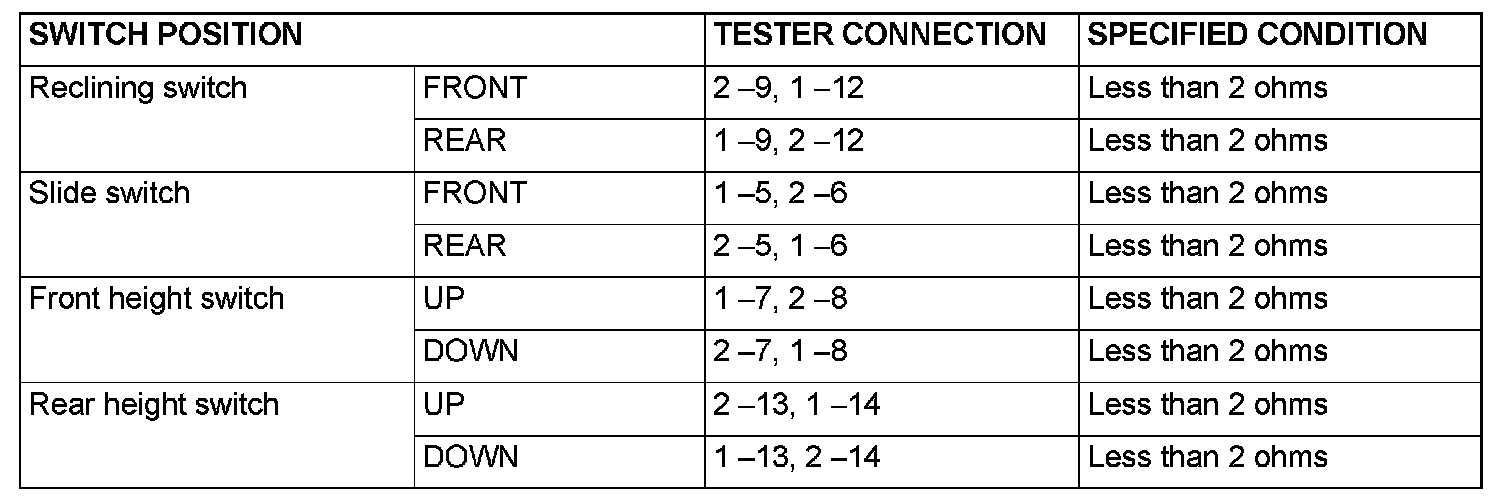 POWER SEAT MANUAL SWITCH CONTINUITY CHECK