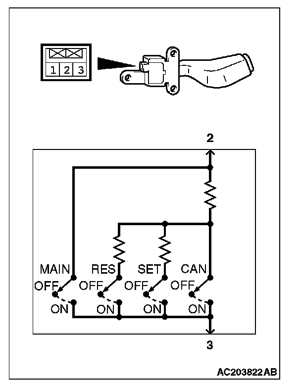 2. Measure the resistance between terminal 2 and terminal 3 when each of the "COAST/SET", "ACC/RES", "CANCEL" and "CRUISE" (MAIN) switches is pressed. If measure values measured at the time correspond to those in the table below, the resistance values are correct.
